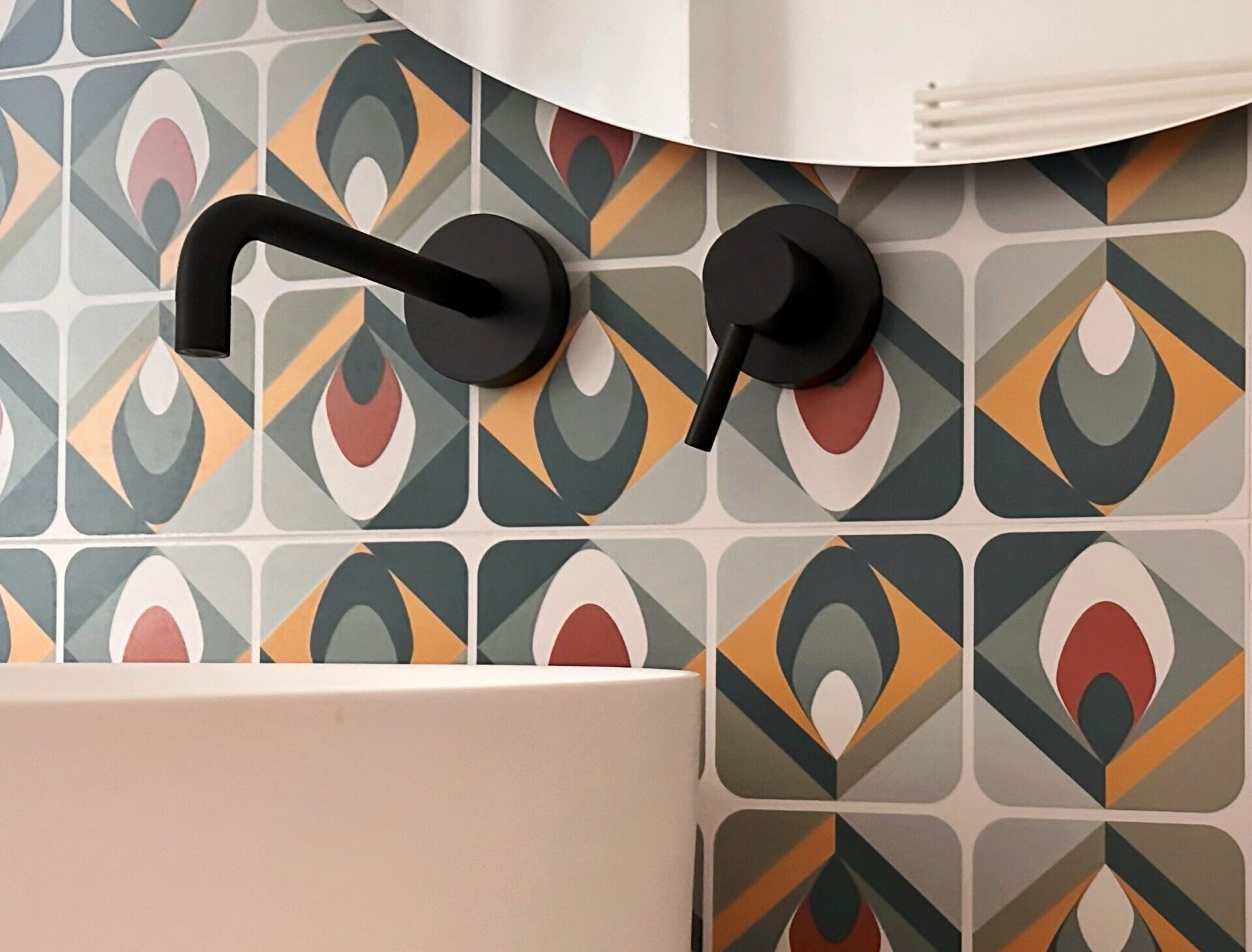 Questa ispirazione a un tempo passato si trova soprattutto nel bagno principale in cui è protagonista il rivestimento della parete del lavabo, una meravigliosa piastrella di Sant’Agostino i cui colori vengono poi richiamati nel mobile del lavabo e nel resto della casa.