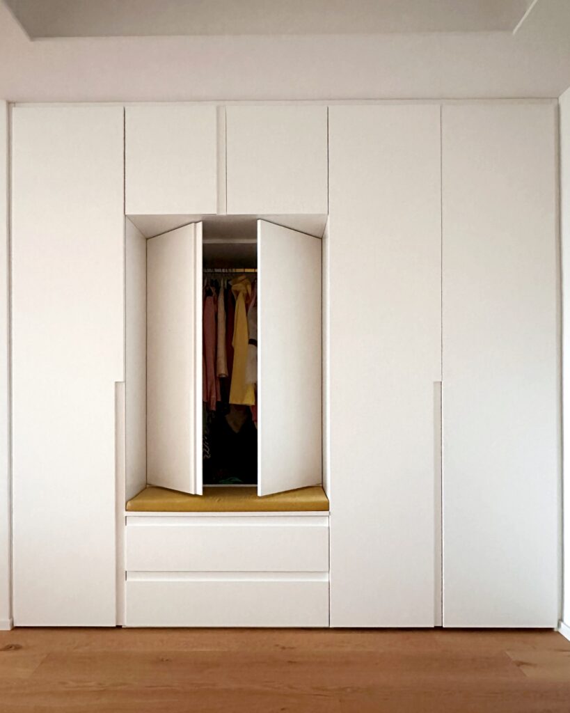 E’ stato così progettato e realizzato in falegnameria un grande armadio su misura, profondo circa un metro, che ha accolto al suo interno: