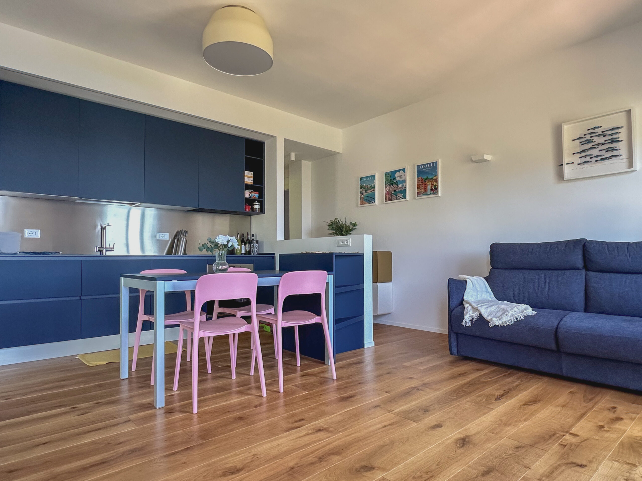 Dal bianco, immaginato inizialmente, siamo passati a una cucina blu intenso con paraschizzi in acciaio, una scelta per nulla convenzionale; la cucina viene completata da un modulo disegnato da me e realizzato su misura necessario sia per accogliere il forno microonde, che per dare un appoggio al tavolo (realizzato con lo stesso piano in fenix blu del top della cucina), questo elemento rende anche più morbido l’arrivo del corridoio sulla zona giorno.