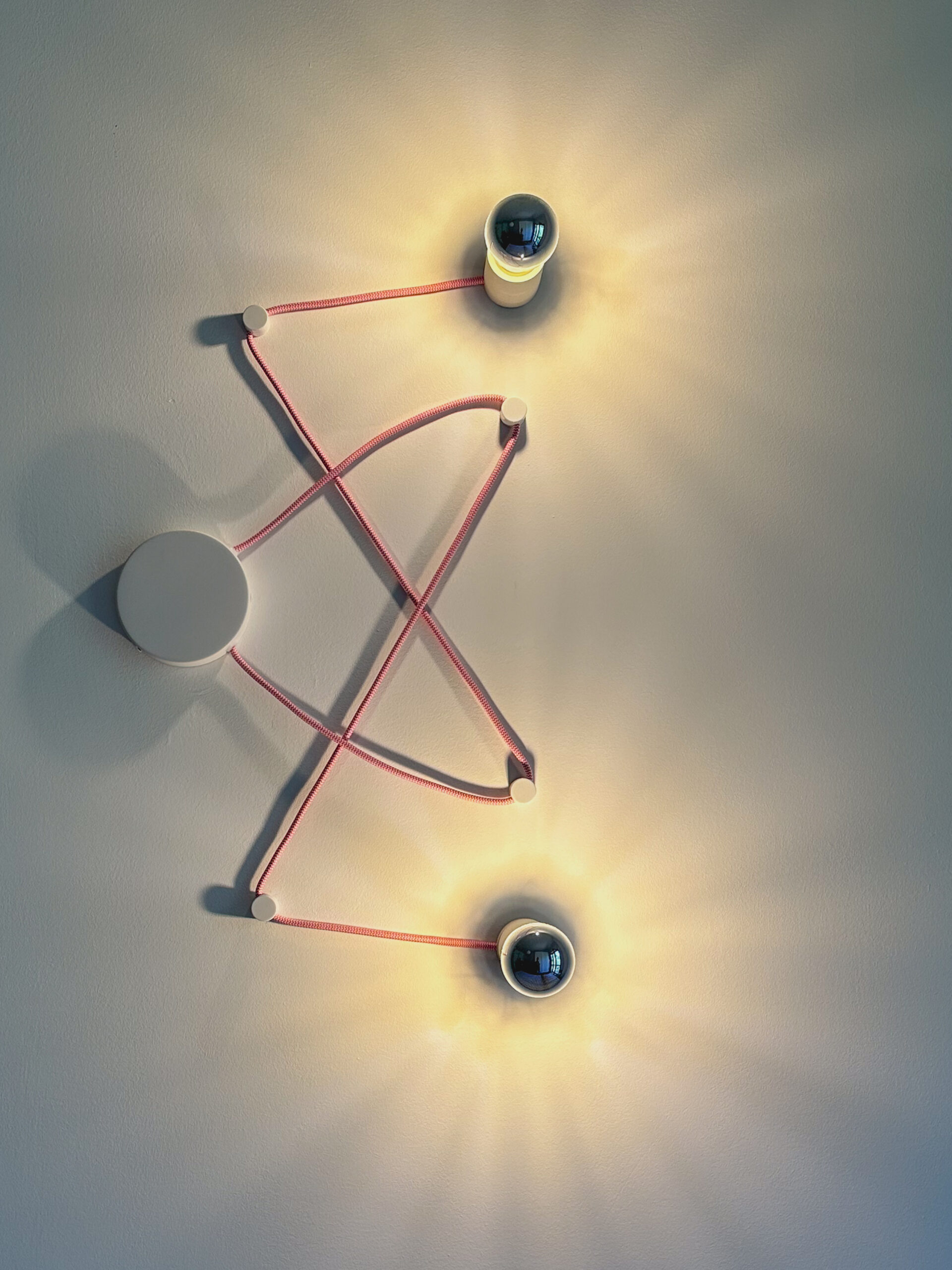 Nella camera dei ragazzi le luci diventano un elemento decorativo sulla parete, una composizione con cavi esterni colorati (rosa e blu) creano un disegno; ho poi selezionato una lampadina con un effetto cromato per rendere meno forte la luce e creare un effetto scenico sul muro.