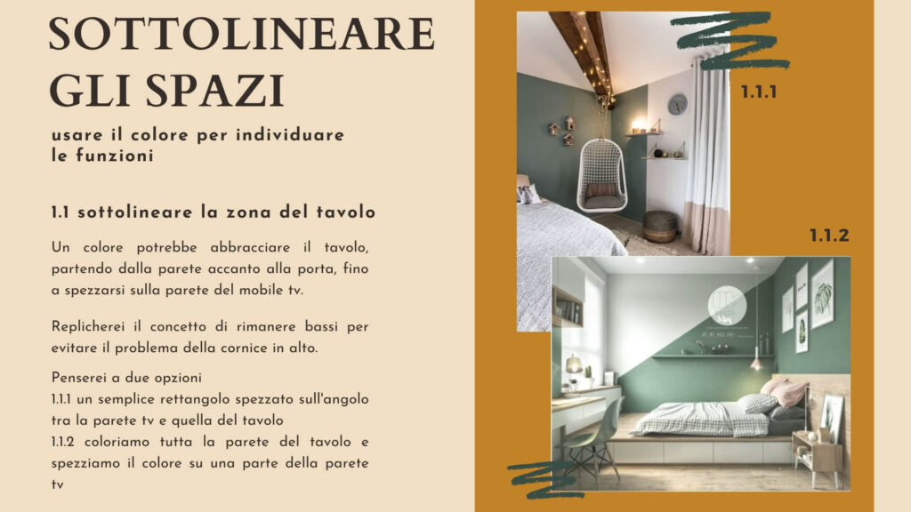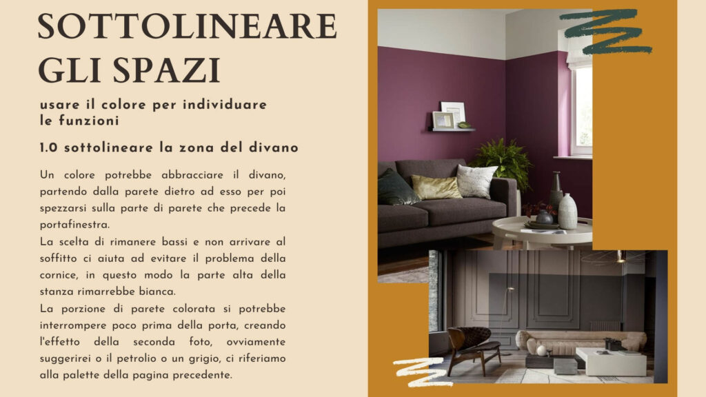 Infatti a livello di “funzioni” il vano accoglieva sia la zona del tavolo da pranzo che il vero e proprio soggiorno per cui il mio consiglio è stato di cercare di dividere idealmente le due aree, come? utilizzando il colore!